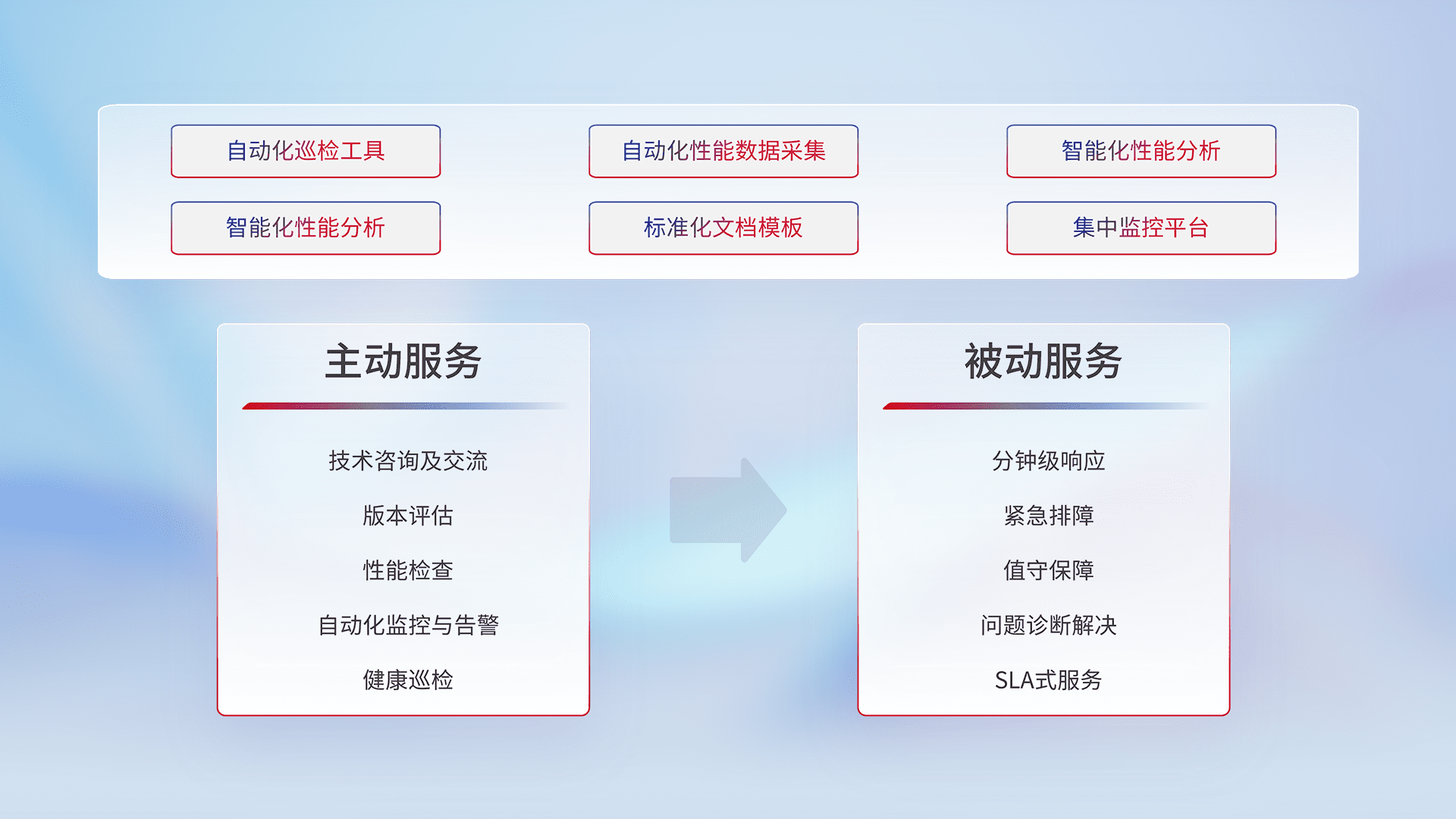 智能化工具和标准化文档,,,,保障服务质量,,,,提供主动服务(包含技术咨询、、版本评估、、、性能检查、、自动化监控与告警、、、健康巡检)和被动服务包含(分钟级响应、、、紧急排障、、、、值守保障、、问题诊断解决、、、SLA服务)。。
